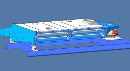 傾角為4-9度的篩箱由驅(qū)動(dòng)箱傳動(dòng),其運(yùn)動(dòng)軌跡在進(jìn)料端為水平圓運(yùn)動(dòng),在長度方向上逐漸變成橢圓運(yùn)動(dòng),*后在出料端變成近似往復(fù)直線運(yùn)動(dòng)。
